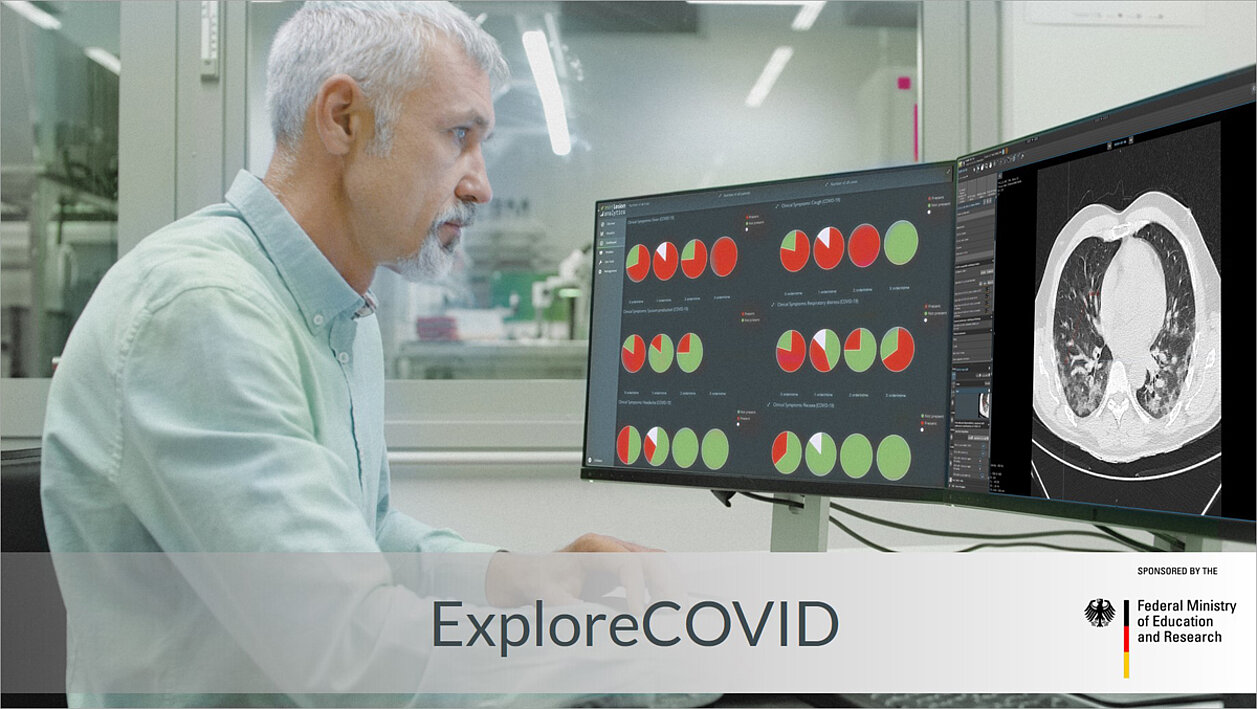 Das ExploreCOVID Projekt, welches gefördert wird vom Bundesministerium für Bildung und Forschung (BMBF), hat als Ziel die Analyse von Patientenanamnese sowie von klinischen und bildgebenden Daten über mehrere medizinische Zentren hinweg, um standardisierbare diagnostische Kriterien zu identifizieren. Dadurch wird eine umfassende Datenbank voller strukturierter Daten etabliert, die für zukünftige epidemiologische Erkenntnisse und Risikostratifizierung von COVID-19 Patienten genutzt werden kann.