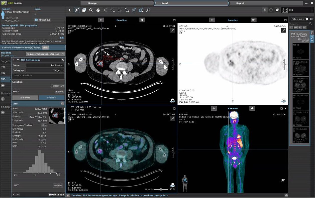 Zahlreiche Verbesserungen und neue Funktionen in Bezug auf den Umgang mit und die Anzeige von multiparametrischen Bilddaten vereinfachen und beschleunigen die Befundung. Hierzu zählt beispielsweise ein neuer Browser zur Auswahl von Bildserien, der zugleich mit einem einzelnen Klick die Anpassung des Bild-Hangings erlaubt. Neben den bestehenden Cross-Reference-Linien zur Orientierung im 3D-Volumen ermöglicht nun ein neues Cross-Hair-Werkzeug eine einfache Navigation in den Bilddaten einschließlich der Auswahl von Läsionen im rotierenden 3D MIP Rendering bei PET-Bilddaten.
