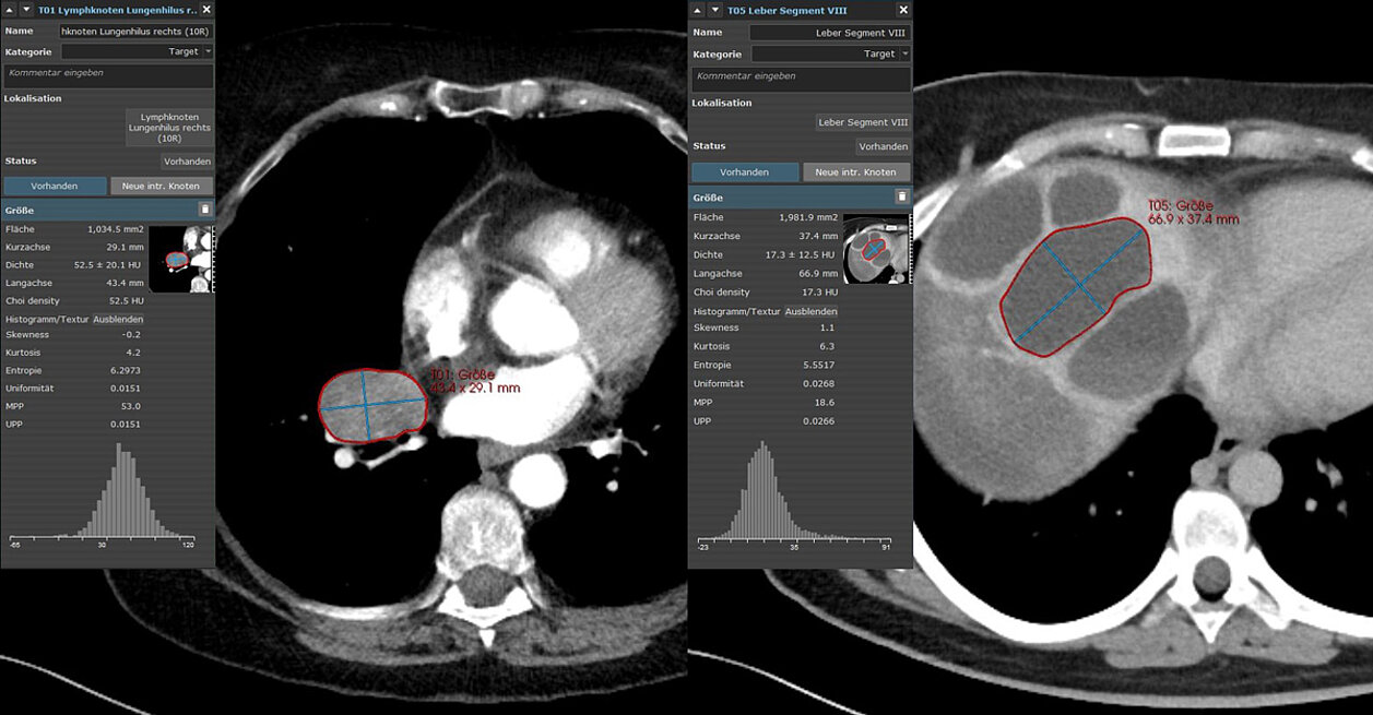 mint Lesion™ wurde zur Extraktion der CT-Biomarker und der flächenbezogenen Texturparameter erster Ordnung sowie zur Beurteilung des Behandlungsansprechens gemäß RECIST 1.1 eingesetzt.