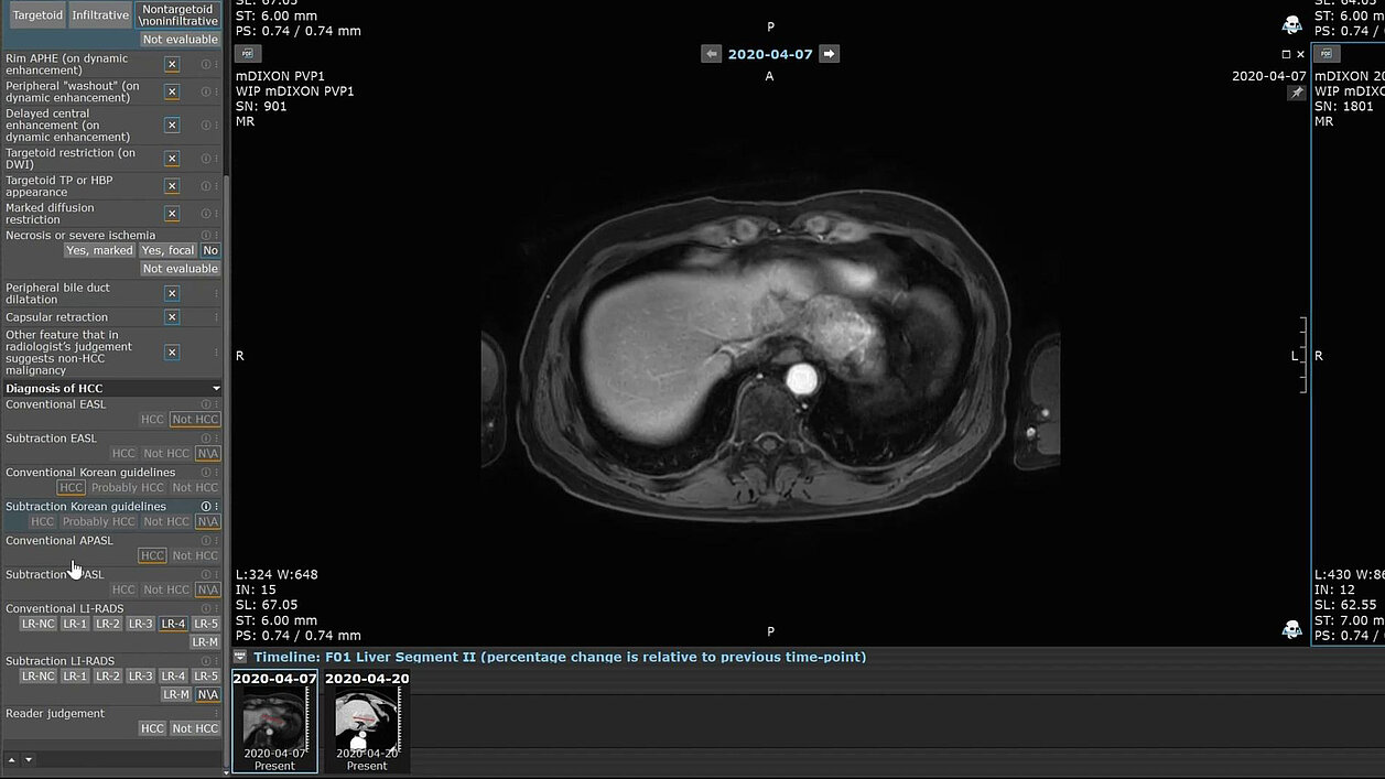 Zwei der Autor:innen arbeiteten mit dem Entwicklungsteam von Mint Medical zusammen, um eine mint Lesion™-Vorlage zu erstellen, die häufige Bildgebungsmerkmale und präzise automatische diagnostische Zuordnungen aus den vier Leitlinien (AASLD/LI-RADS, KLCA-NCC, EASL und APASL) integriert.