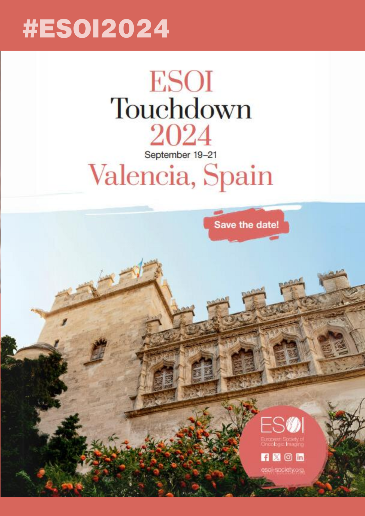 ESOI Touchdown 2024 Valencia is the second in a series of congresses, each taking place in a different European world-class city, to highlight the expertise of local radiologists and clinicians. This current edition promises to bring cutting-edge research and teaching to the Ilustre Colegio de Médicos de Valencia. Enjoy various lectures, workshops, and presentations.
