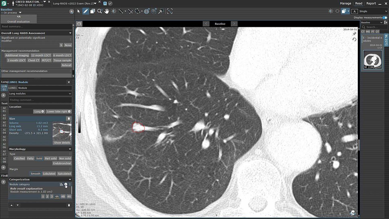 mint Lesion supports the Lung-RADS 2022 guidelines, featuring built-in automated scoring to enhance accuracy and consistency in lung nodule evaluation. contextflow ADVANCE Chest CT extends its capabilities beyond nodules, assisting in the analysis of COPD and *coming soon* identifying calcifications in coronary vessels, equipping users with deeper insights for comprehensive care.